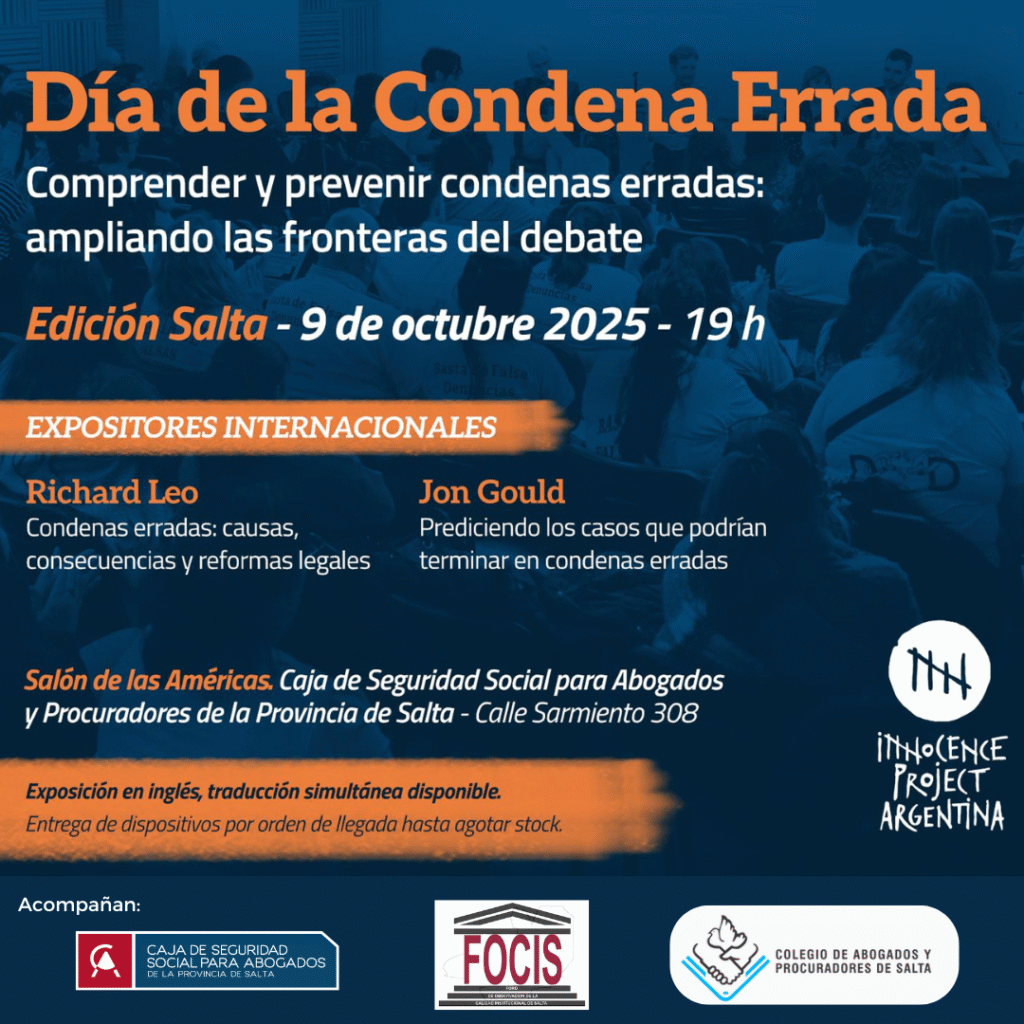 Apoyan este eventoInnocence Project Argentina , el Colegio de Abogados , la Caja de Seguridad Social para Abogados y Procuradores de la Provincia y el Foro de Observación de la Calidad Institucional de Salta.