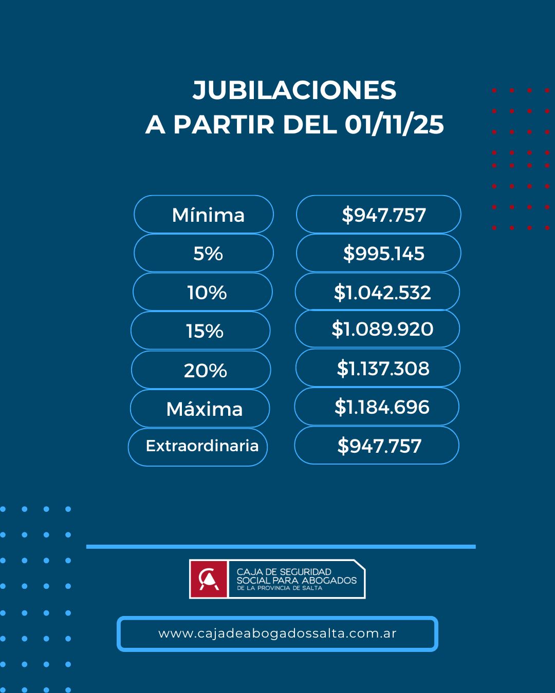El Consejo de Administración de la Caja de Seguridad Social para Abogados de la Provincia de Salta resolvió en el aplicar un aumento escalonado en los haberes previsionales, para el año 2025, con el siguiente cronograma: Con estos incrementos a partir del mes de noviembre las jubilaciones serán de: A partir del mes de noviembre las pensiones serán de: […]