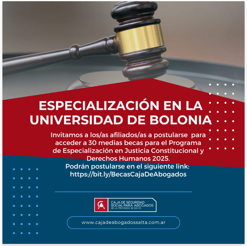 Desde la Caja de Seguridad Social para Abogados de la provincia de Salta, sortearemos 30 medias becas para acceder al Programa de Especialización en Justicia Constitucional y Derechos Humanos 2025.