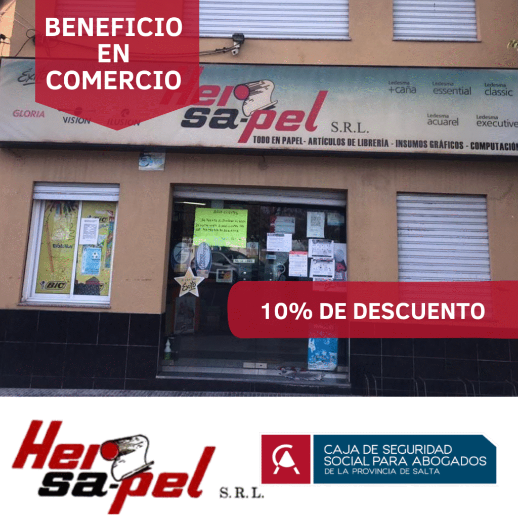 Desde la Caja de Seguridad Social para Abogados de la provincia de Salta firmamos un convenio de beneficios con Hersapel S.R.L, para el descuento del 10% para compras en efectivo de artículos de librería escolar, excepto aquellos que se encuentren de oferta, debidamente identificados.