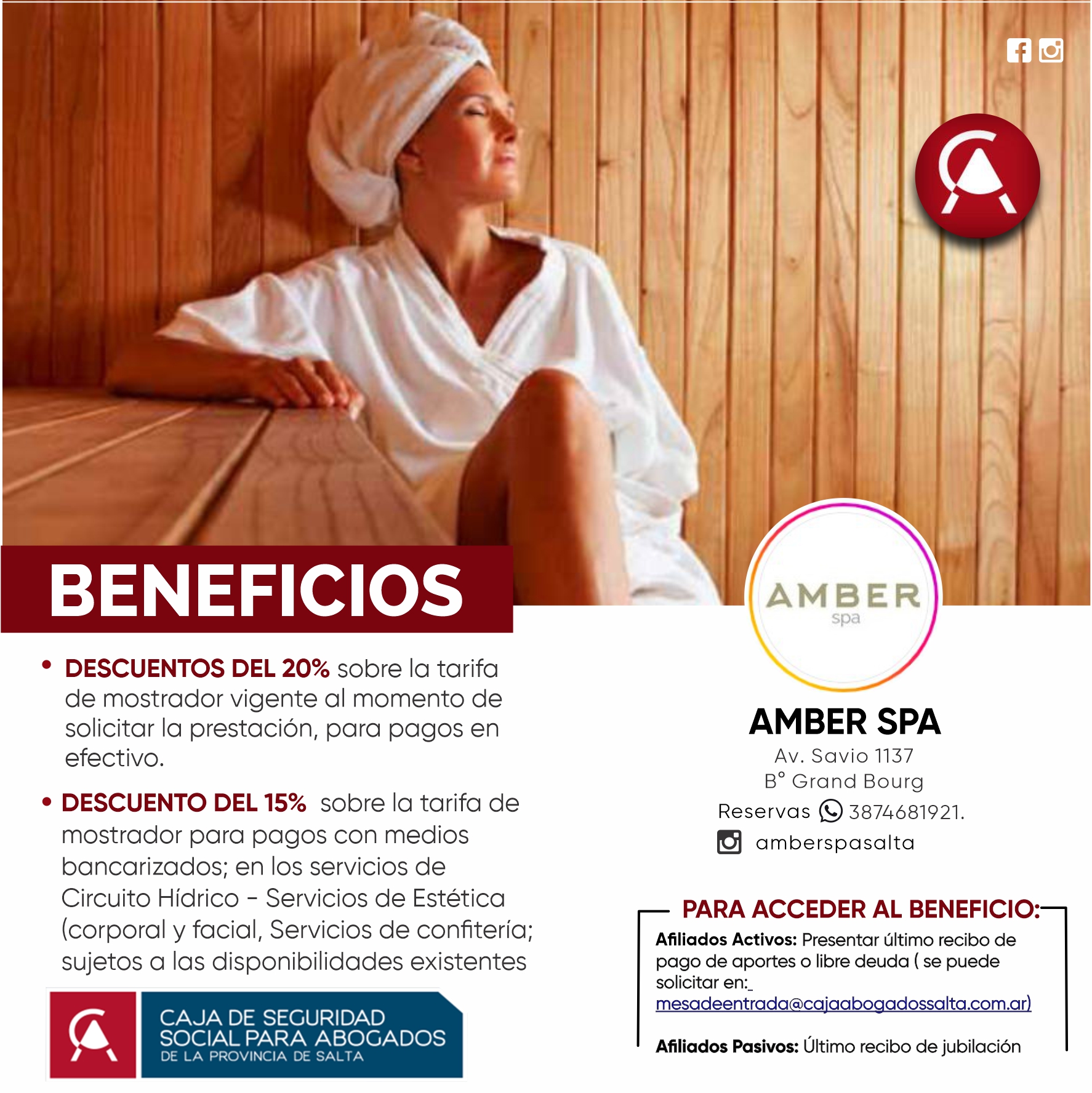 DESCUENTOS DEL 20% Y 15% DESCUENTO DEL 20% sobre tarifa mostrador precios vigentes, al momento de solicitar la prestación pagos en efectivo. DESCUENTO DEL 10% sobre tarifa mostrador precios vigentes con pagos bancarizados, en los servicios de Circuito Hídrico, Estética facial o corporal. Servicios de confitería sujetos a disponibilidad existente.