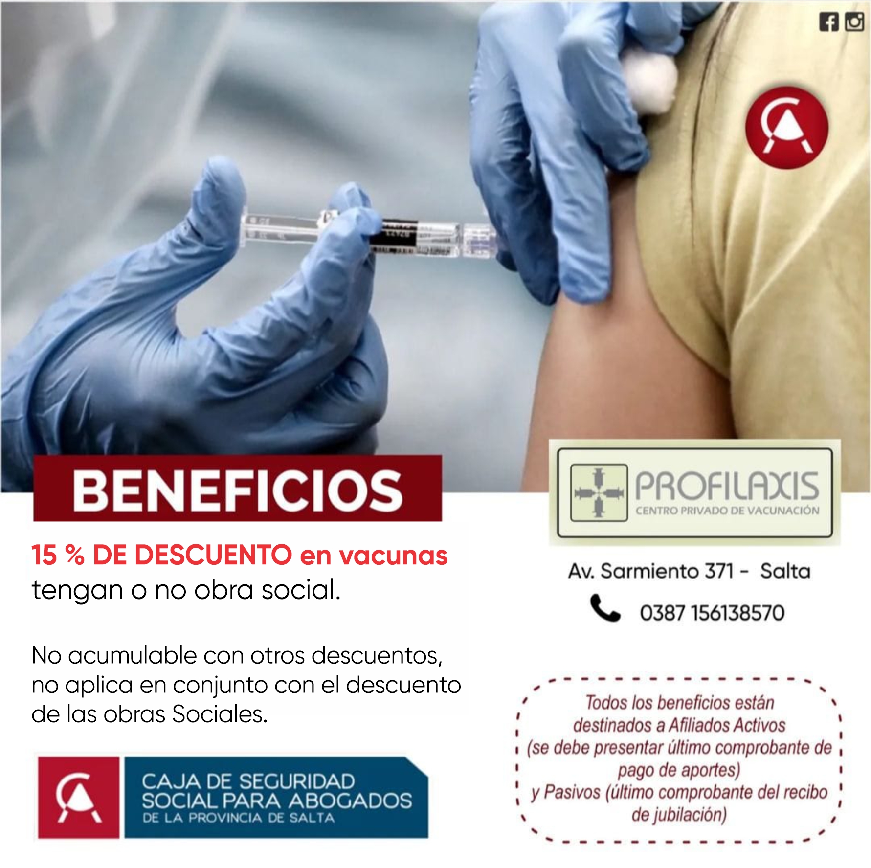 15% de descuento en vacunas 15% de descuento en vacunas tengan o no obra social. No acumulable con otros descuentos, no aplica en conjunto con el descuento de las obras sociales, deberá optar por uno. Cualquier duda consulte en nuestra sede de la Caja de abogados
