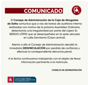 Desvinculación de cajero El Consejo de Administración de la Caja de Abogados de Salta a raíz de tareas de auditoria interna realizadas con motivo de