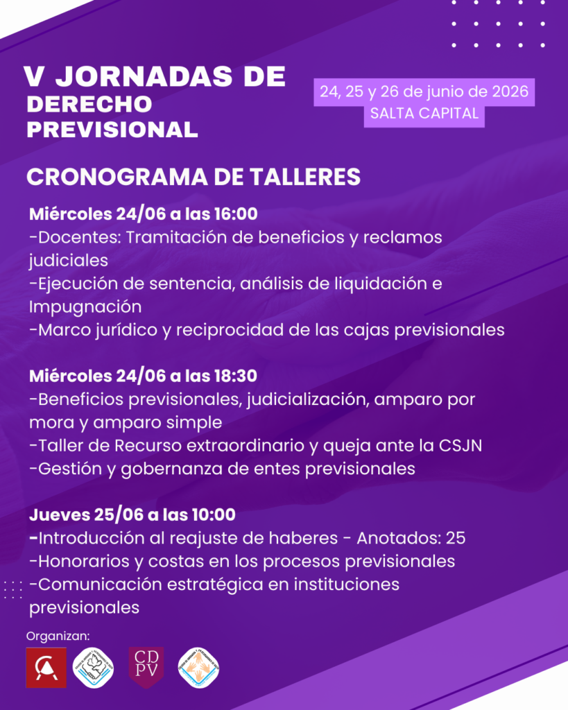 Bajo el lema “Seguridad Social y federalismo: crisis del sistema y desafíos del ejercicio profesional en la defensa de los derechos previsionales”, se llevarán a cabo en la ciudad de Salta las V Jornadas de Derecho Previsional, un espacio de reflexión y actualización destinado a analizar los desafíos actuales del sistema previsional.